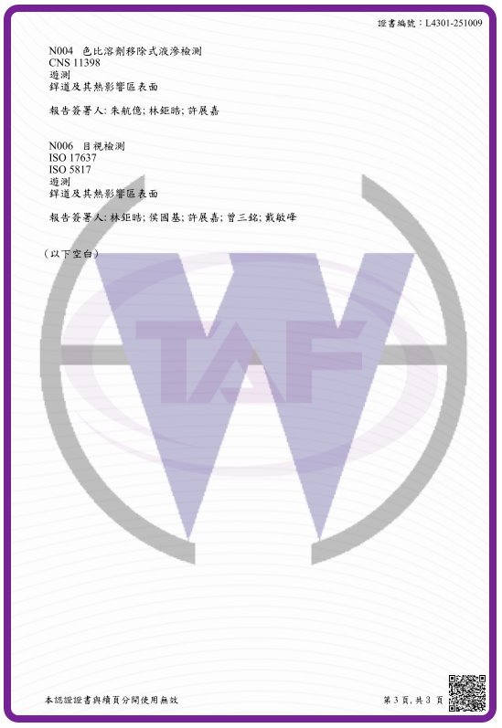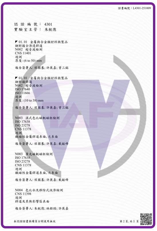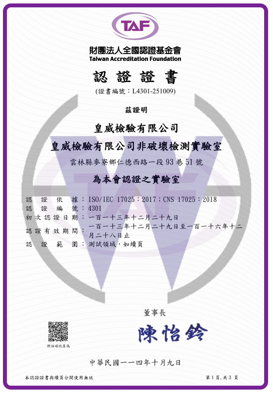 首頁 ﹥ 檢測項目 > 公司認證 財團法人全國認證基金會認證證明 本公司皇威檢驗有限公司非破壞檢測實驗室通過財團法人全國認證基金會認證之實驗室認證依據 ISO/IEC 17025 : 2017 ; CNS 17025 : 2018認證編號 4301